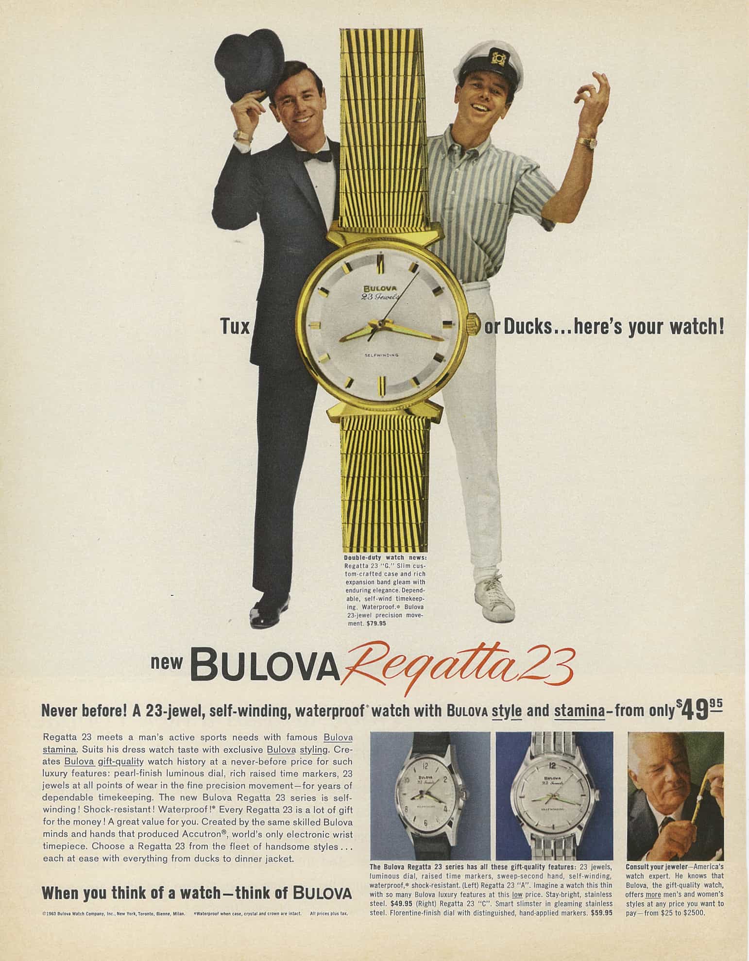 Современная коллекция Bulova Regatta - это современное воплощение старого подхода Буловой к изящному и классическому стилю. Предлагается в различных размерах и цветовых вариантах. Регата подходит для любого любителя часов. Коллекция включает в себя изделия с запасными белыми циферблатами и римскими цифрами, придающими классический и элегантный оттенок, а также глубокий и прочный синий, оставаясь верным морской теме, которая была частью эстетики регаты в течение 60 лет. Корпуса хорошо отполированы, а циферблаты глянцевые, что позволяет этим часам играть со светом. Использование римских цифр в избранных ссылках добавляет модный стиль, как это было на моделях наследия. И дизайн циферблата был тщательно продуман, с использованием нескольких вариантов отделки и глубоких радиальных рисунков, обеспечивающих многие из тех же драматических эффектов, что и на винтажных предметах. Часы в коллекции Regatta имеют фирменную подпись Bulova и любимый дизайн с открытым сердцем, позволяя владельцу видеть движение механизма, отклоняющееся от циферблата при проверке времени. Как напоминает нам Карл Розен, это создает настоящую эмоциональную связь с часами и вашей личной историей. «Как только ты связал свою жизнь с Буловой, - говорит он, - ты не можешь их отпустить». Пожалуй, самым заметным элементом дизайна в новой коллекции Regatta является то, как Bulova обновила дизайн наконечника T-образной планки.