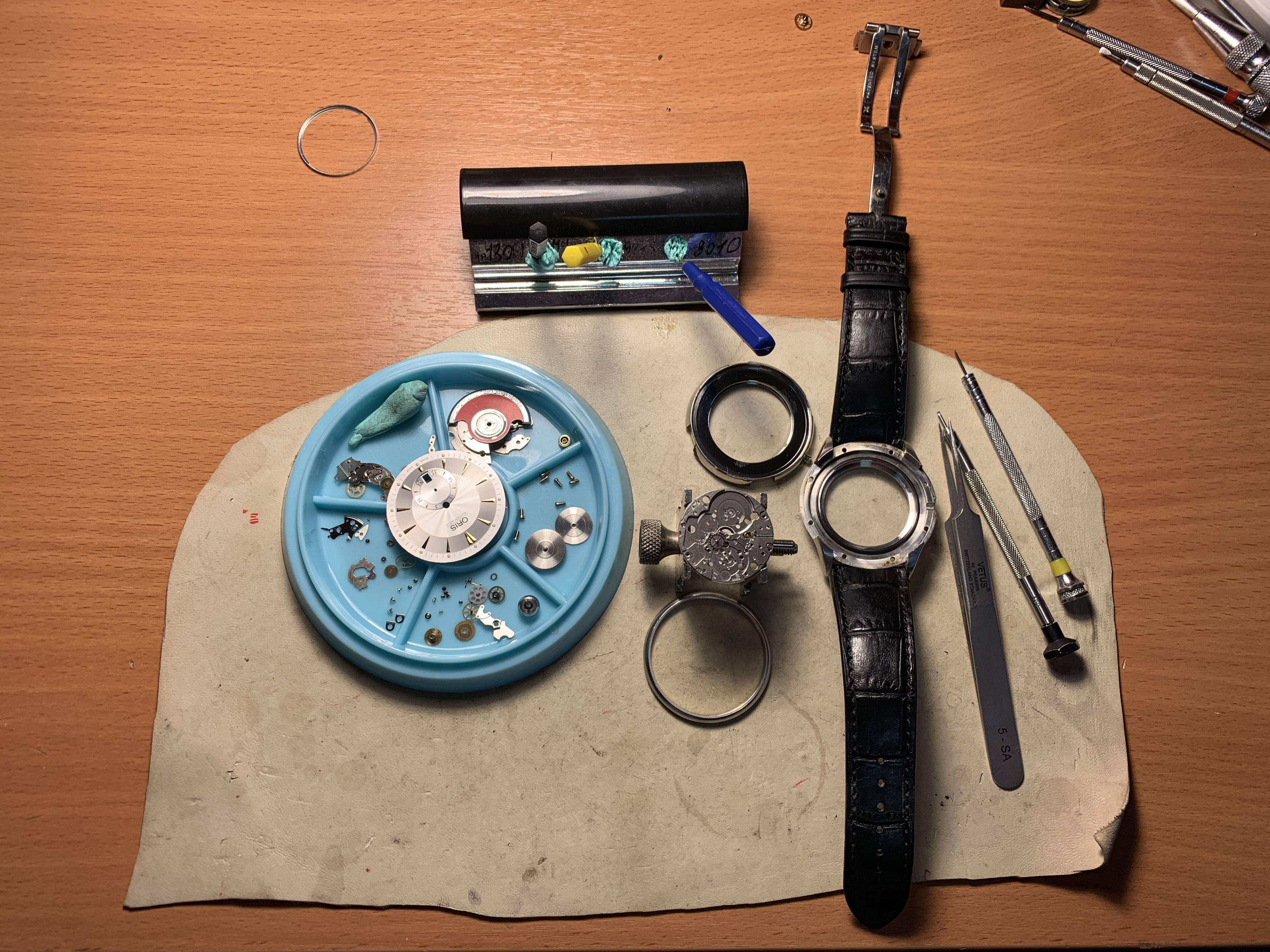 Магнитный Ротор: любые металлические фрагменты в механизме или старые масла притягиваются к Ротору и будут прилипать к нему. Это должно быть исправлено. Я вращаю ротор в Rodico, пока он не станет идеальным. Механизм настройки: он должен работать плавно и легко, но при этом достаточно твердо, чтобы случайно не выскочить в положение времени или даты. Маслом (масло D5 - мое предпочтение) нужно смазать каждую часть, которая натирает другую, минимально необходимым количеством. Колесо: эта часть позволяет установить время без вращения всех колес. Его нужно смазать маслом (снова масло D5) и двигаться плавно, но при этом иметь достаточное трение, чтобы не проскользнуть. Шестерни на секундном колесе слишком длинные, чтобы смазать их на месте, поэтому перед сборкой их необходимо смазать маслом (масло mobus 9010). Убедитесь, что колеса могут свободно двигаться: каждое колесо должно быть свободно закреплено в своем драгоценном камне с небольшим зазором вверх. После того, как вы установите мост, смажьте маслом (9010 масло) верхнюю и нижнюю шестерни каждого колеса с помощью часового масла. В колодце должно быть едва достаточно масла, чтобы увидеть его через глазное стекло.