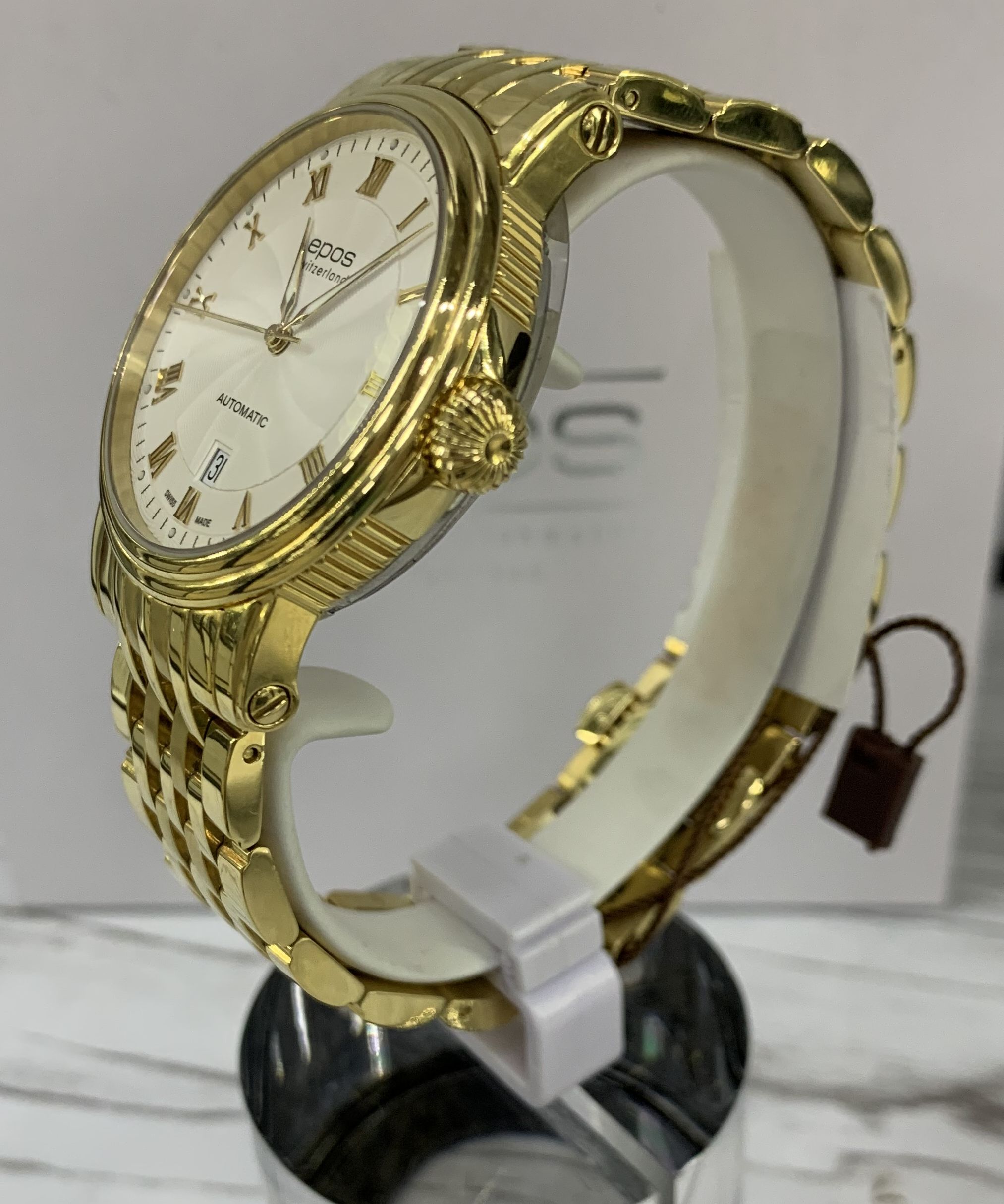 Швейцарские механические мужские наручные часы с автоподзаводом Epos 3390.152.22.20.32 на золотом стальном браслете с PVD покрытием. Корпус часов также выполнен из нержавеющей стали. Циферблат круглой формы, белого цвета. Сапфировое стекло по прочности, уступающее только алмазу. Водозащита часов 50 метров. Окно даты.